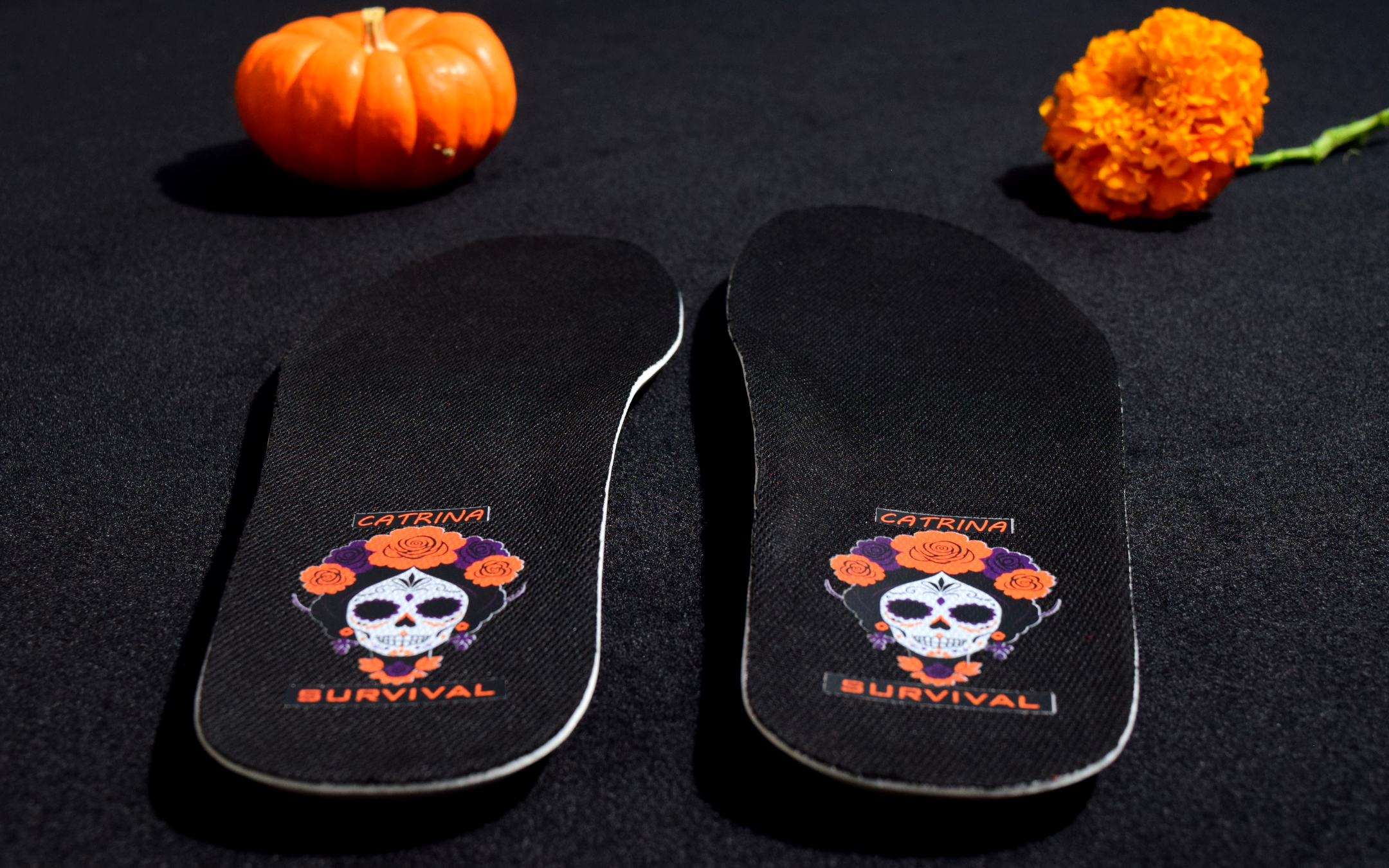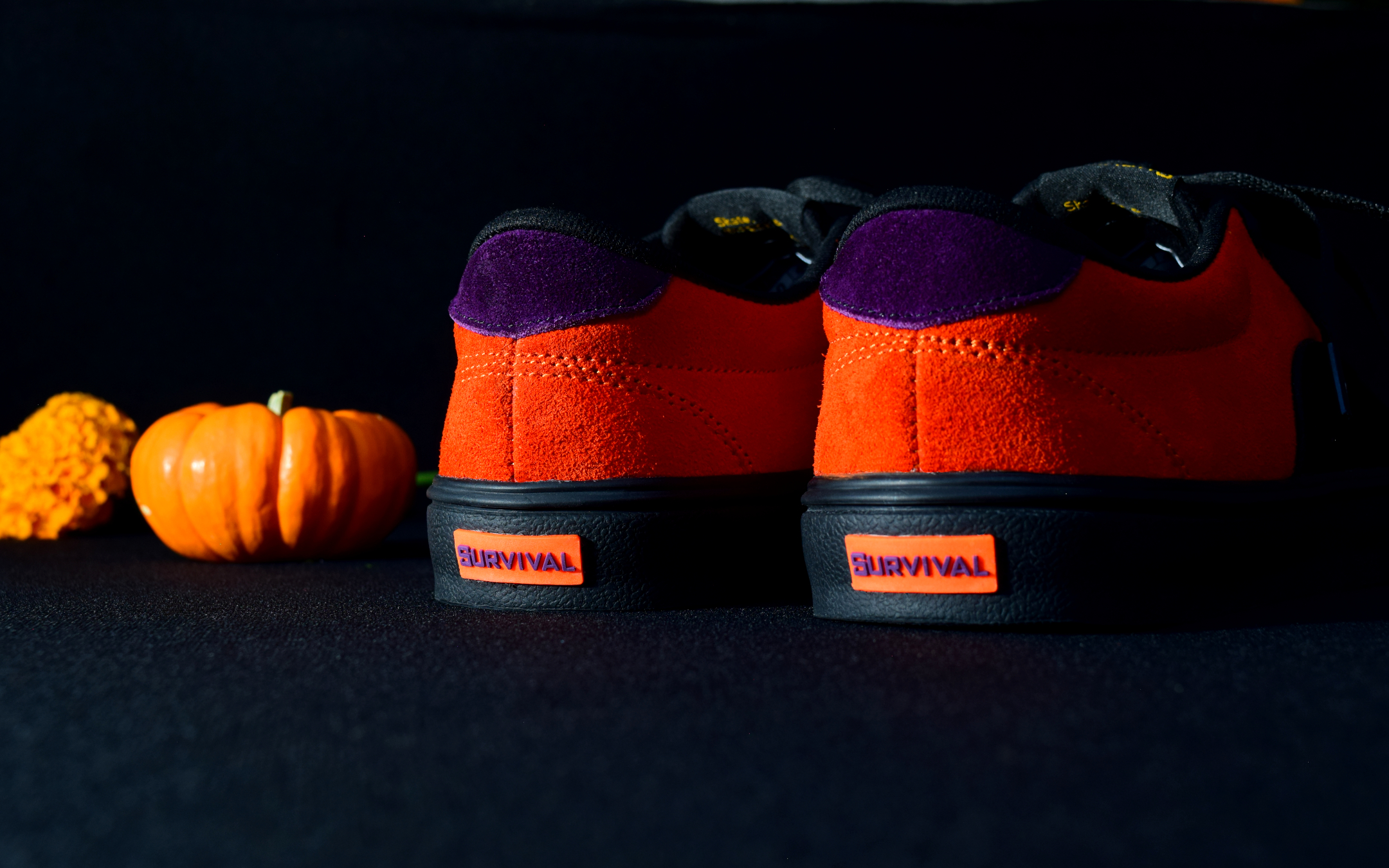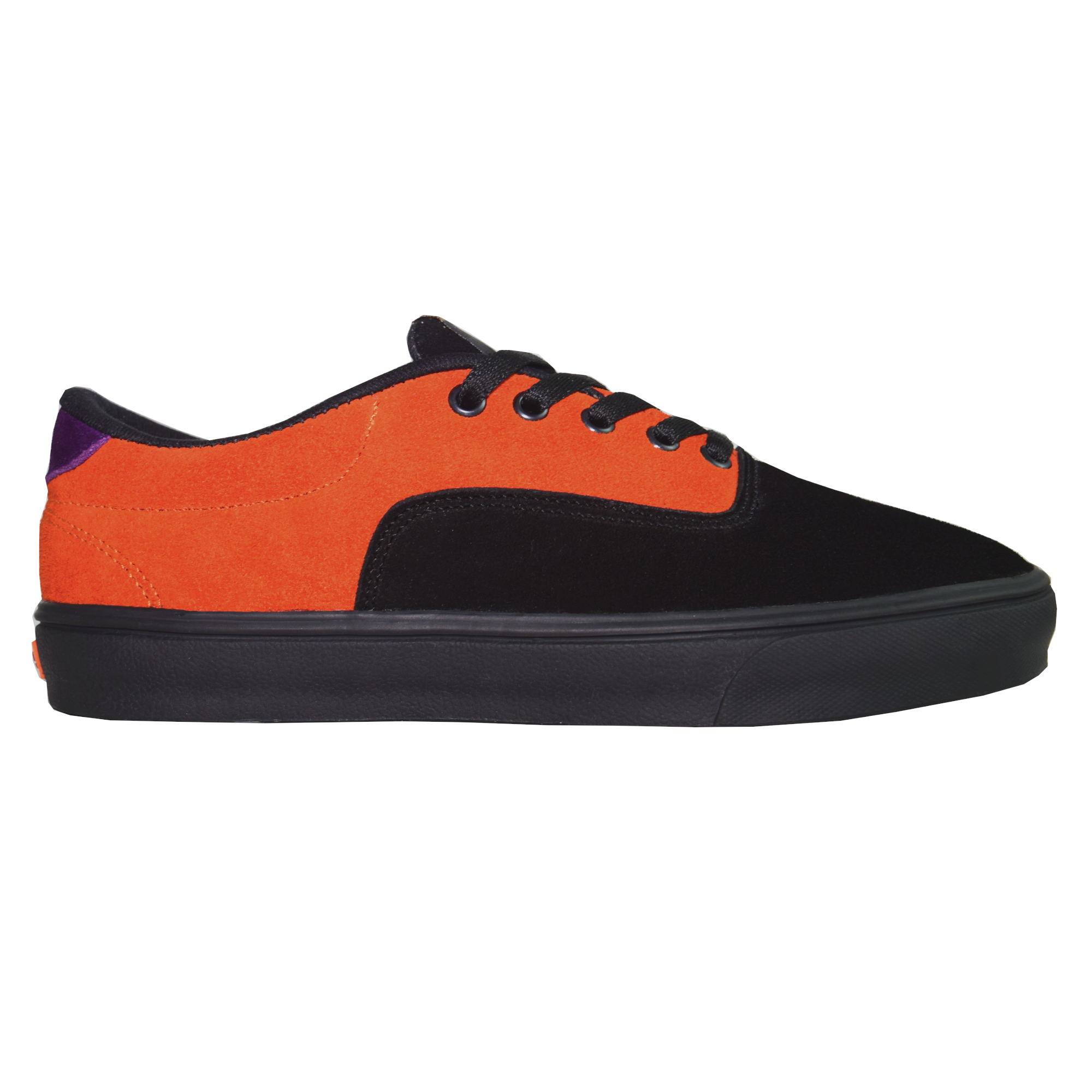 Corte de piel gamuza color negro con anaranjado (Vacuno), suela de hule color negra con anaranjado, vivos en negro y morado, forro negro sintético.