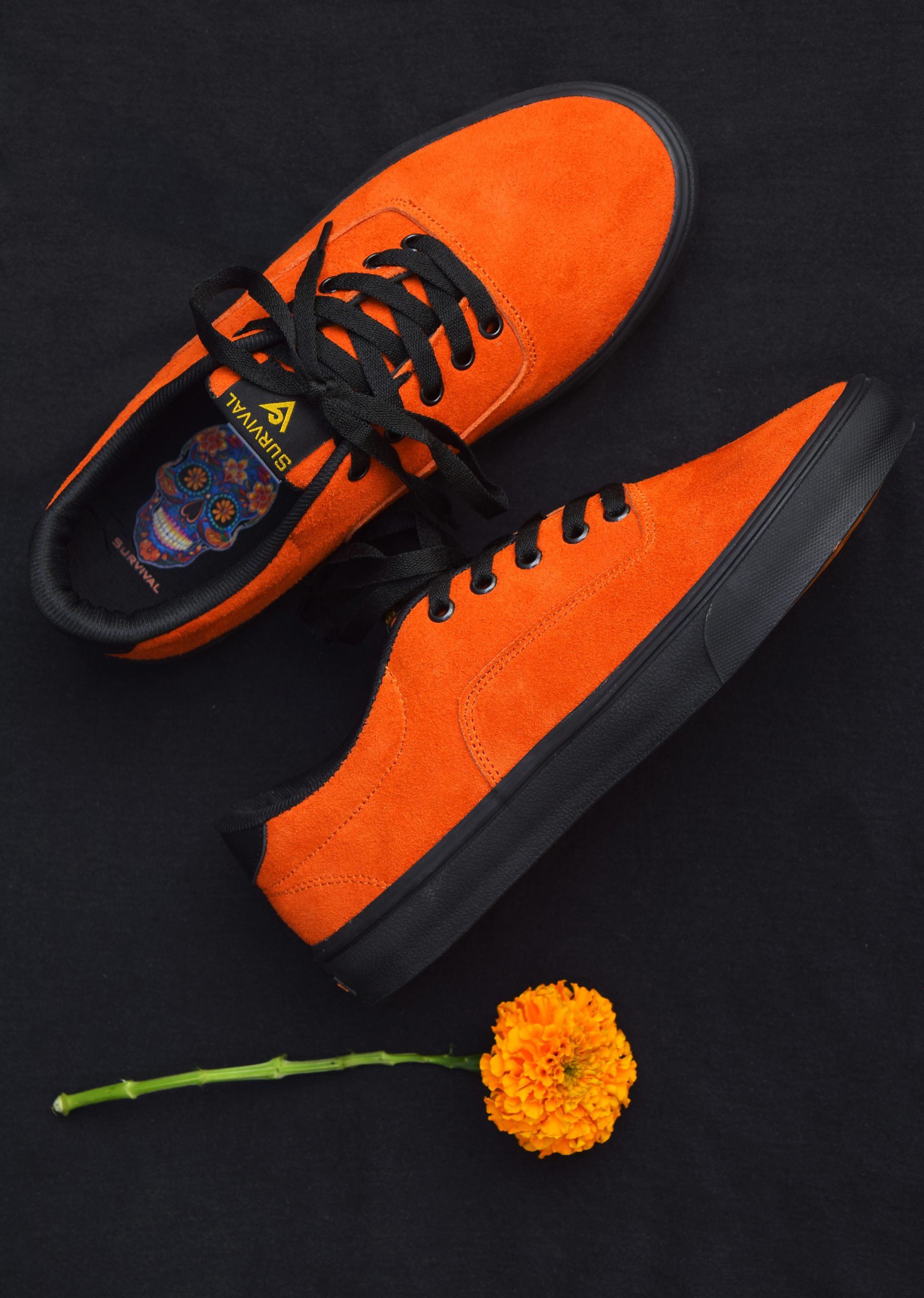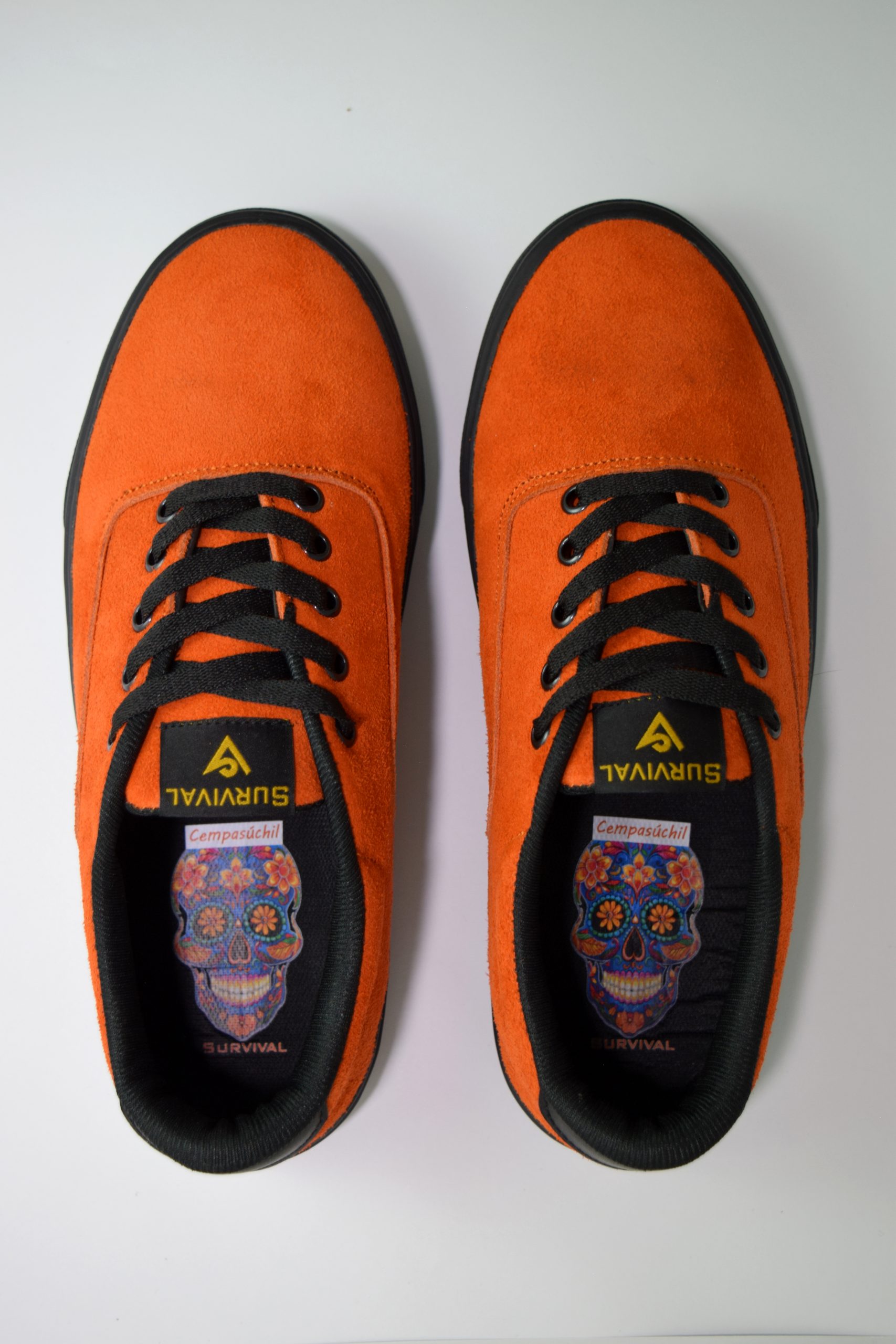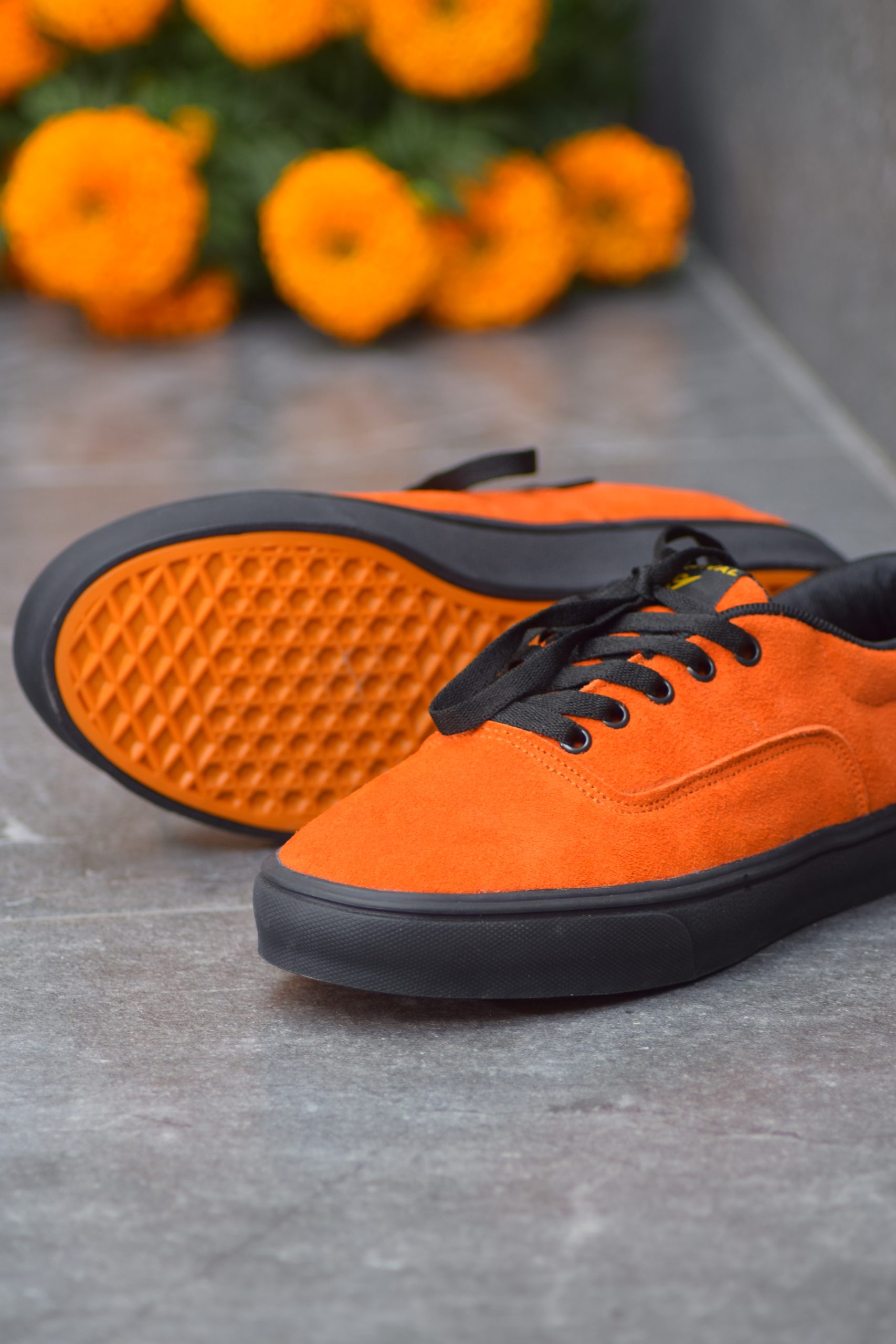 Corte de piel gamuza color anaranjado (Vacuno), suela de hule color negra con anaranjado, vivos en negro y forro sintético.