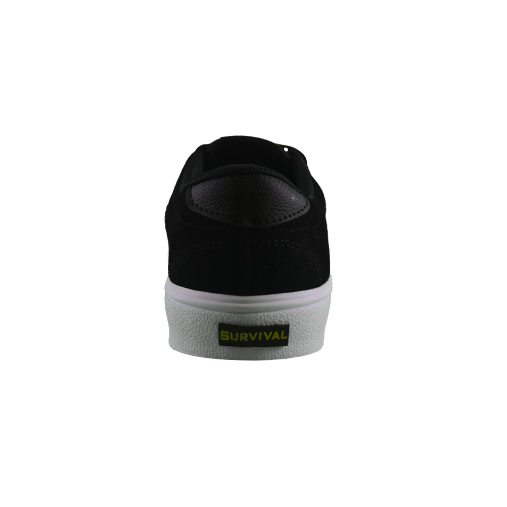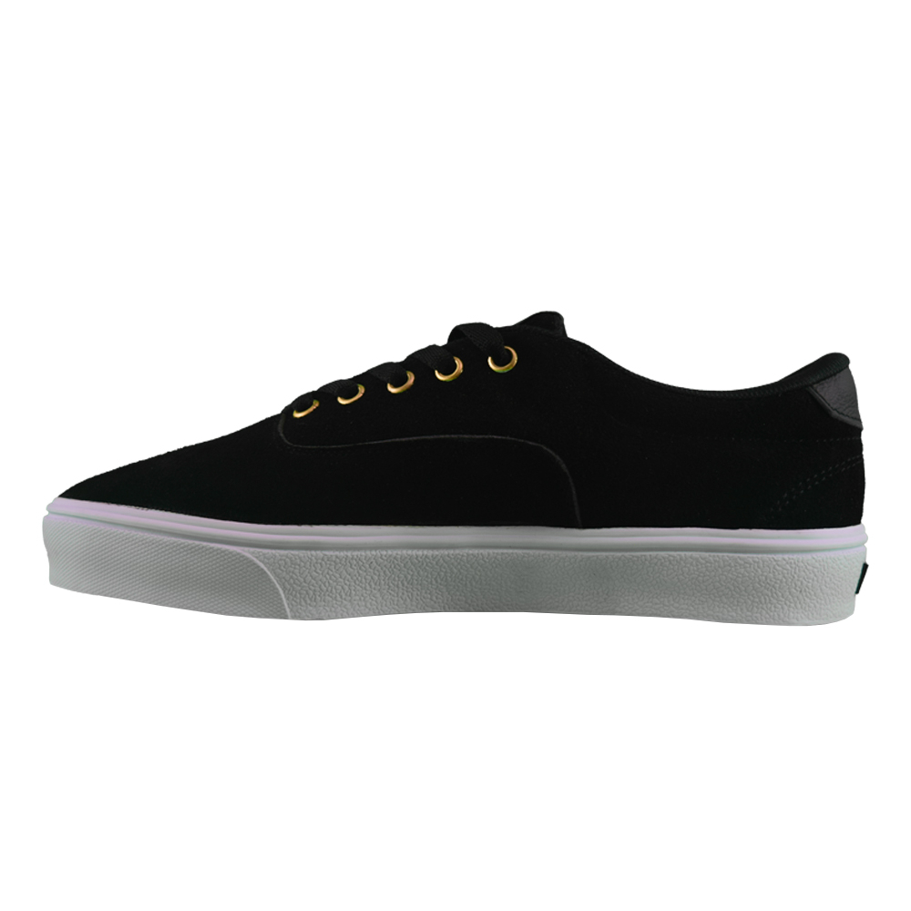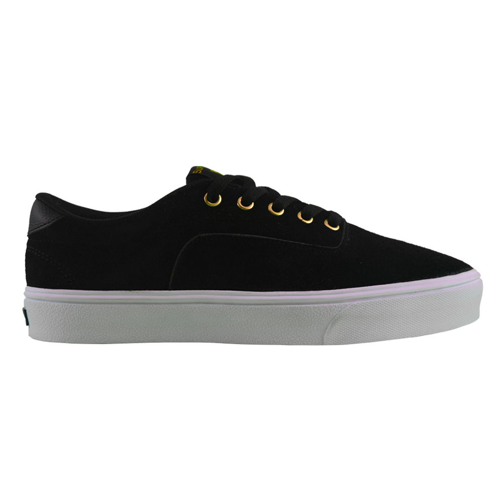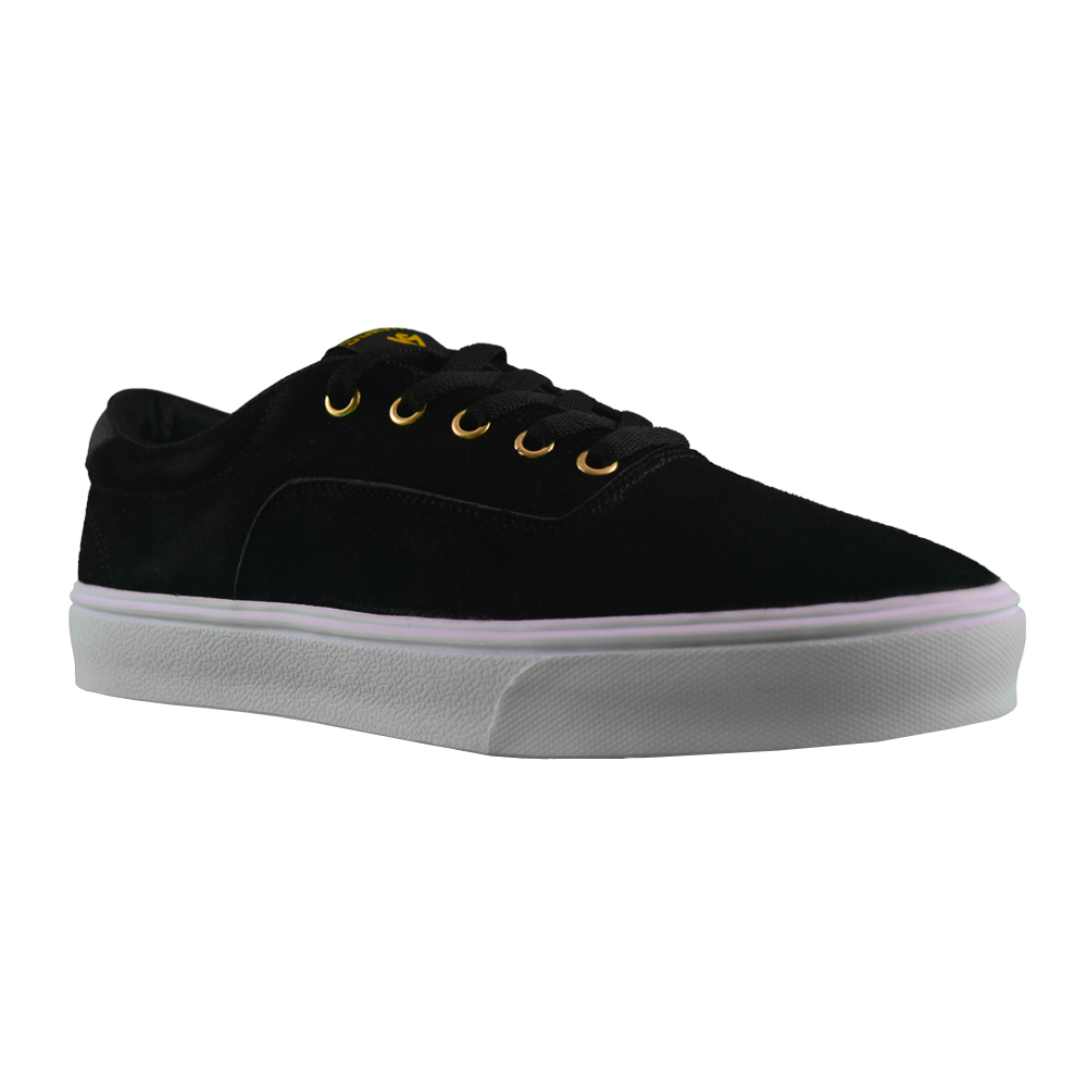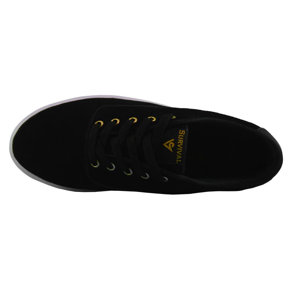 Corte de piel gamuza color negro (Vacuno), suela de hule color blanca, vivos en color oro y forro sintético.