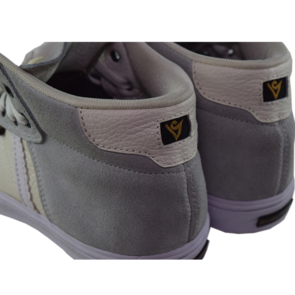 Corte de gamuza y piel color blanco (Vacuno), suela de hule color blanca, forro sintético, vivos en color oro y protector de hule negro vulcanizado.